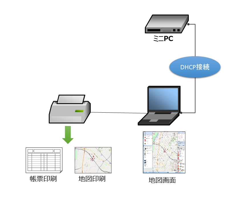 ミニPC(コンパクト、3万円から5万円)を利用する事で、低価格でインターネットに接続せずローカルエリアネットワーク(LAN)で、手軽に、パーソナルな「eコミマップ」が動作する環境を作成できます。