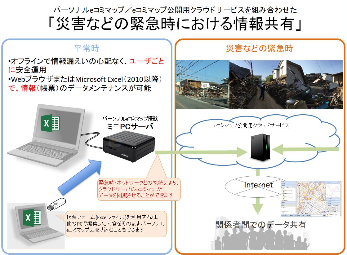 またミニPC(サーバ)は、災害時などにはインターネットに繋げば、クラウドサーバなどにインストールされたeコミマップと自動同期され、関係者との情報の共有も可能となります。